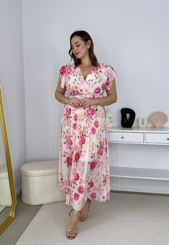 BELLA SUKIENKA MAXI PLUS SIZE PLISOWANA W DROBNE KWIATY. FUKSJA/BIEL 11