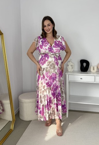 BELLA SUKIENKA MAXI PLUS SIZE PLISOWANA W DUŻE KWIATY. BEŻOWO/FUKSJA 11