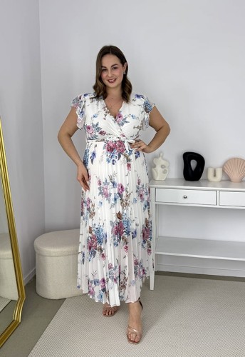 BELLA SUKIENKA MAXI PLUS SIZE PLISOWANA W DUŻE KWIATY. BIAŁO/BŁĘKITNA 05