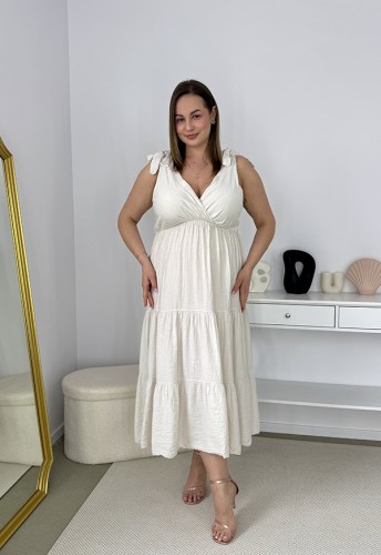 BOW WISKOZOWA SUKIENKA PLUS SIZE NA RAMIĄCZKACH Z ROZKLOSZOWANYM DOŁEM I KOKARDAMI. BIAŁA 02