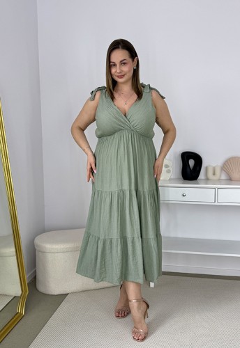 BOW WISKOZOWA SUKIENKA PLUS SIZE NA RAMIĄCZKACH Z ROZKLOSZOWANYM DOŁEM I KOKARDAMI. OLIWKOWA 01