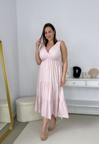 BOW WISKOZOWA SUKIENKA PLUS SIZE NA RAMIĄCZKACH Z ROZKLOSZOWANYM DOŁEM I KOKARDAMI. PUDROWY RÓŻ 03