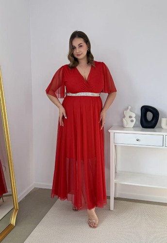 DORA II MAXI TIULOWA DŁUGA SUKIENKA Z SIATECZKI OZDOBNYM PASKIEM. CZERWONA 01