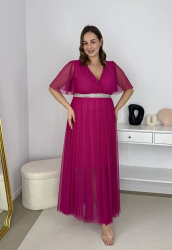 DORA II MAXI TIULOWA DŁUGA SUKIENKA Z SIATECZKI OZDOBNYM PASKIEM. FUKSJA 07