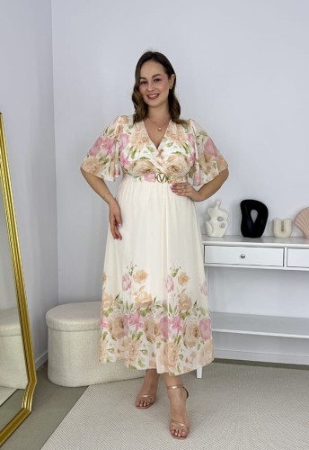 FLORA DŁUGA SZYFONOWA SUKIENKA ROZKLOSZOWANA Z OZDOBNYM PASKIEM W KWIATY. KREMOWO/PUDROWA 04