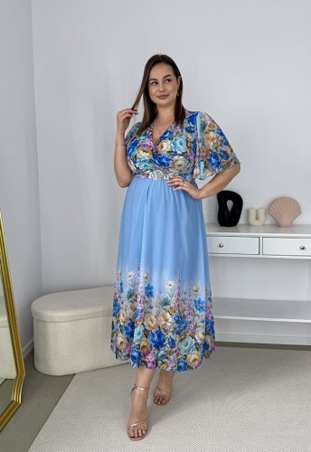 FLORA DŁUGA SZYFONOWA SUKIENKA ROZKLOSZOWANA Z OZDOBNYM PASKIEM W KWIATY. NIEBIESKA 05