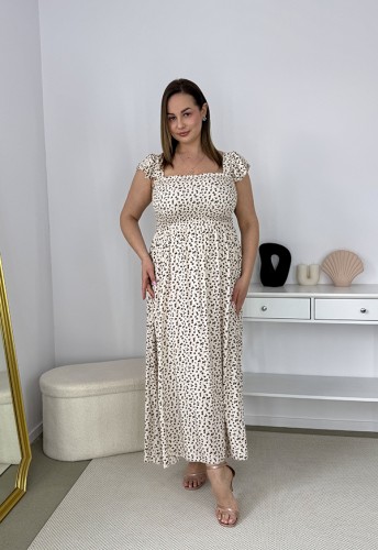 HANA DŁUGA SUKIENKA Z WISKOZY W DRODNE KWIATYO KROJU HISZPANKI. KREMOWA 01