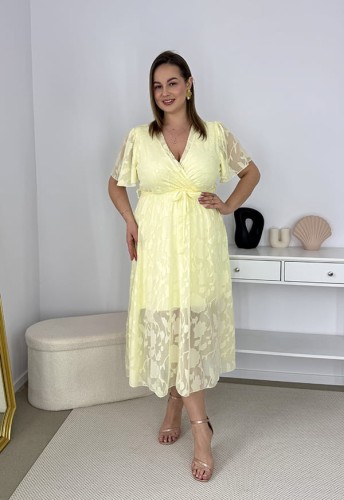 LUIZA SZYFONOWA SUKIENKA MIDI ROZKLOSZOWANA Z OZDOBNYM HAFTEM. MASEŁKOWA ŻÓŁTA 01
