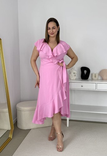 OLIVIA KOPERTOWA ROZKLOSZOWANA SUKIENKA PLUS SIZE Z FALBANAMI. CUKIERKOWY RÓŻ 01