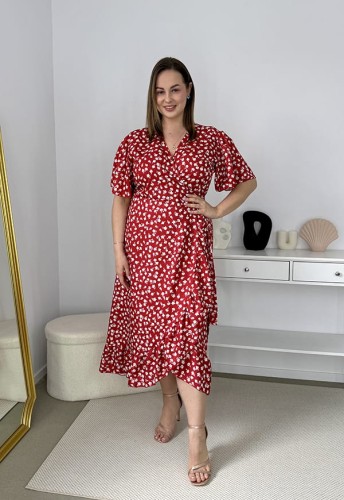 SAMANTA KOPERTOWA ROZKLOSZOWANA SUKIENKA PLUS SIZE W KWIATY. CZERWONA 02