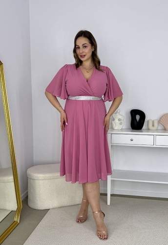 SOFIA II SZYFONOWA SUKIENKA DO KOLAN ROZKLOSZOWANA Z OZDOBNYM PASKIEM. BRUDNY RÓŻ 04
