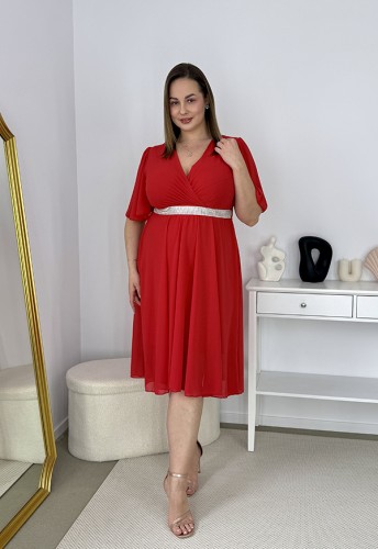 SOFIA II SZYFONOWA SUKIENKA DO KOLAN ROZKLOSZOWANA Z OZDOBNYM PASKIEM. CZERWONA 08