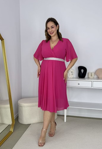 SOFIA II SZYFONOWA SUKIENKA DO KOLAN ROZKLOSZOWANA Z OZDOBNYM PASKIEM. FUKSJA 03