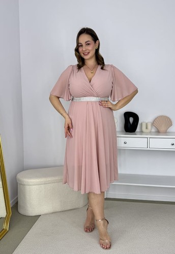 SOFIA II SZYFONOWA SUKIENKA DO KOLAN ROZKLOSZOWANA Z OZDOBNYM PASKIEM. PUDROWY RÓŻ 02